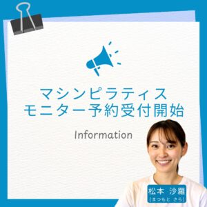 こんにちは、Studio TAIKA 横浜菊名店の松本沙羅です。 このたび、マシンピラティスのモニター予約を開始いたします♩ こんな方におすすめです: • ピラティスに興味がある方 • 姿勢を整えたい方 • 身体の違和感 […]